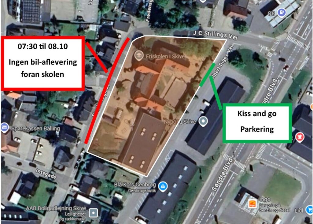 Af sikkerhedsmæssige årsager skal børn ikke afleveres foran skolen i bil (07:10-08:10), da det skaber utrygge situationer for de mange, der ankommer på cykel.